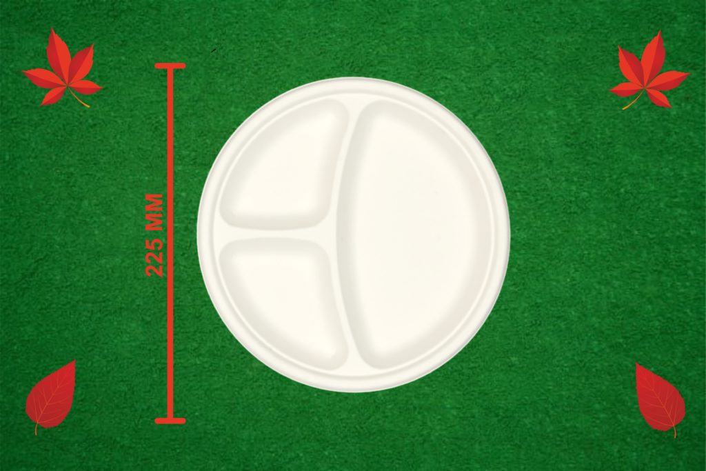 The 9-3 Compartment Plate is perfect for large meals, featuring three distinct sections to keep food neatly separated. Made from biodegradable sugarcane bagasse, it is eco-friendly, and supports sustainable living. Ideal for events, parties, and meal services, this plate seamlessly combines practicality with environmental responsibility.